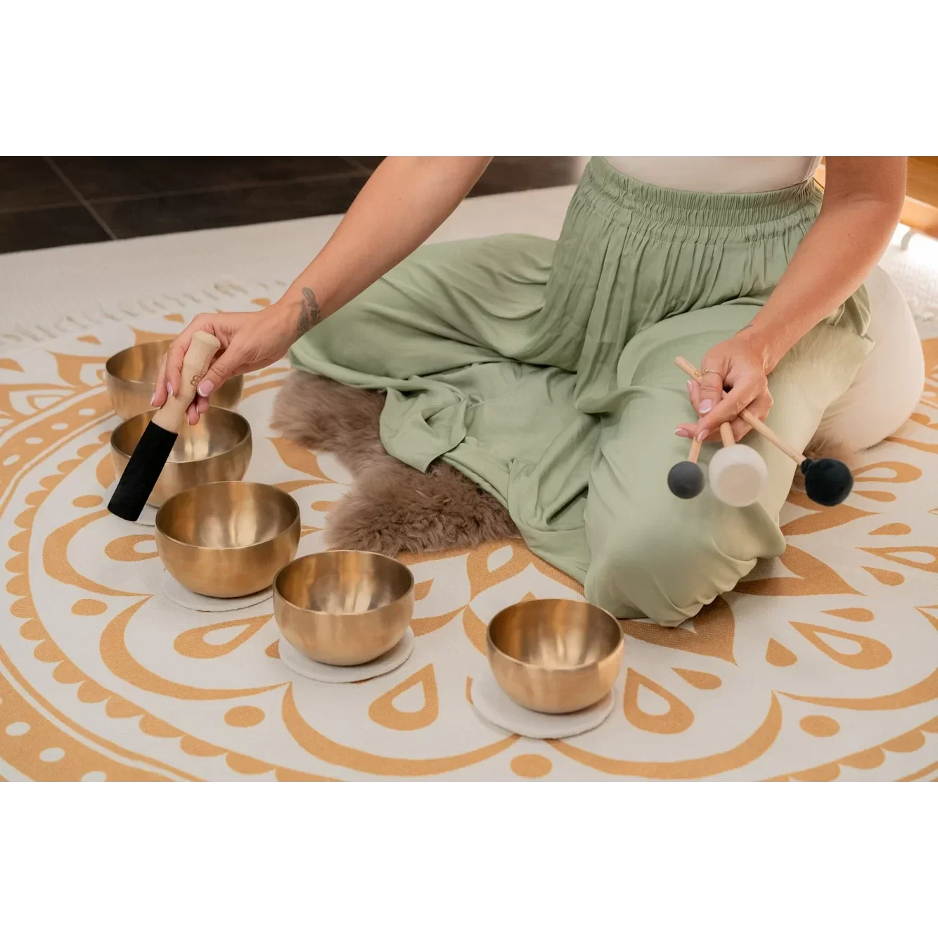 Ensemble 3 Bols tibétains YOGA NIDRA : SBU400, SBU500, SBU600, SBU700, SUB750. Livré avec 4 mailloches de résonance bois et cuir, les cercles en feutre (supports) et les housses pour chaque bol. Fabrication artisanale en Inde à partir d'alliage de Bronze.