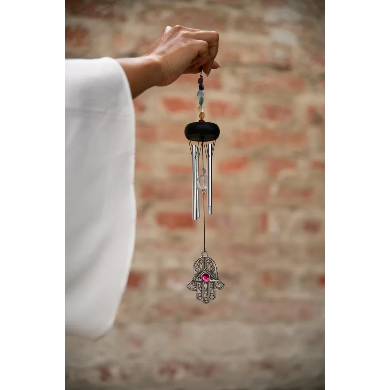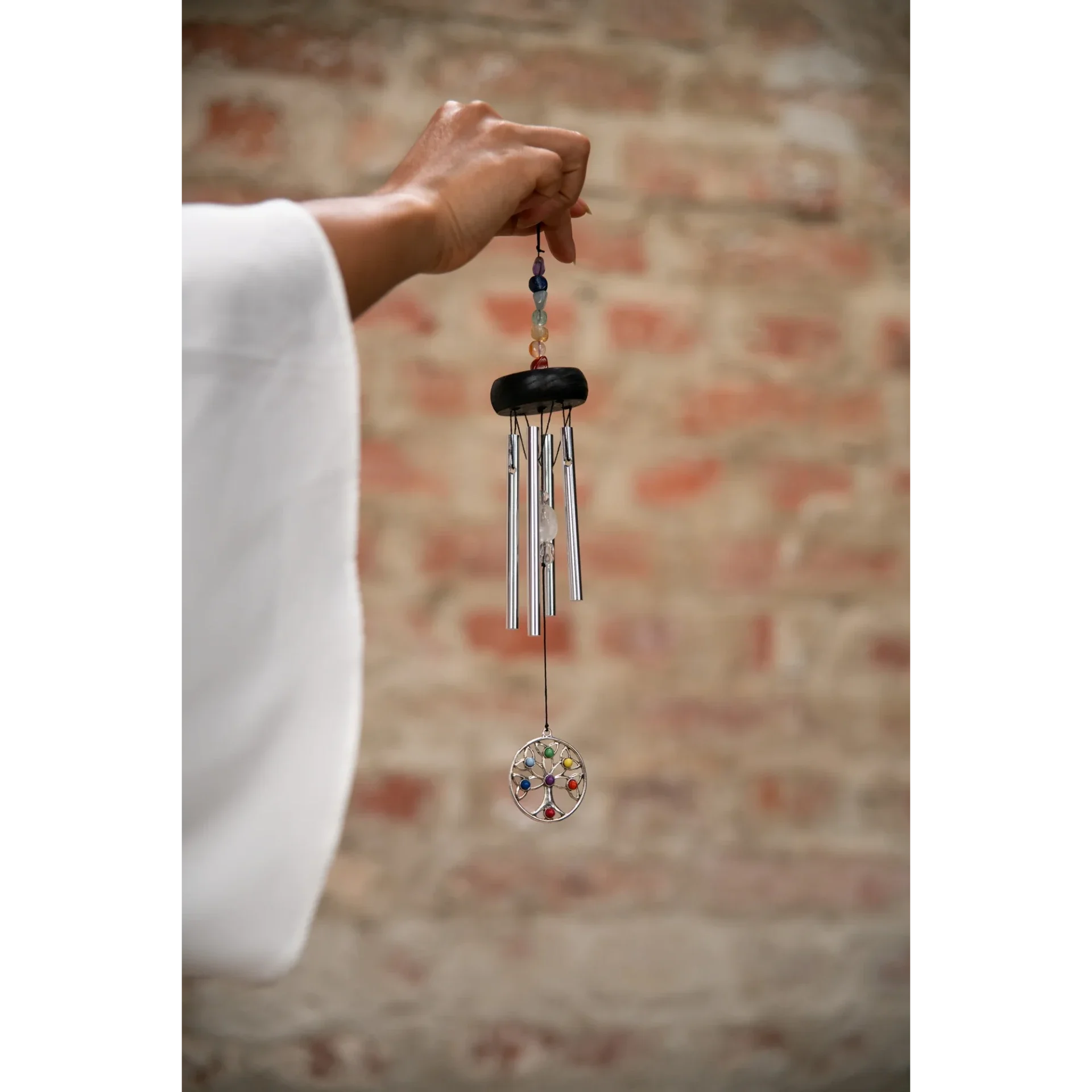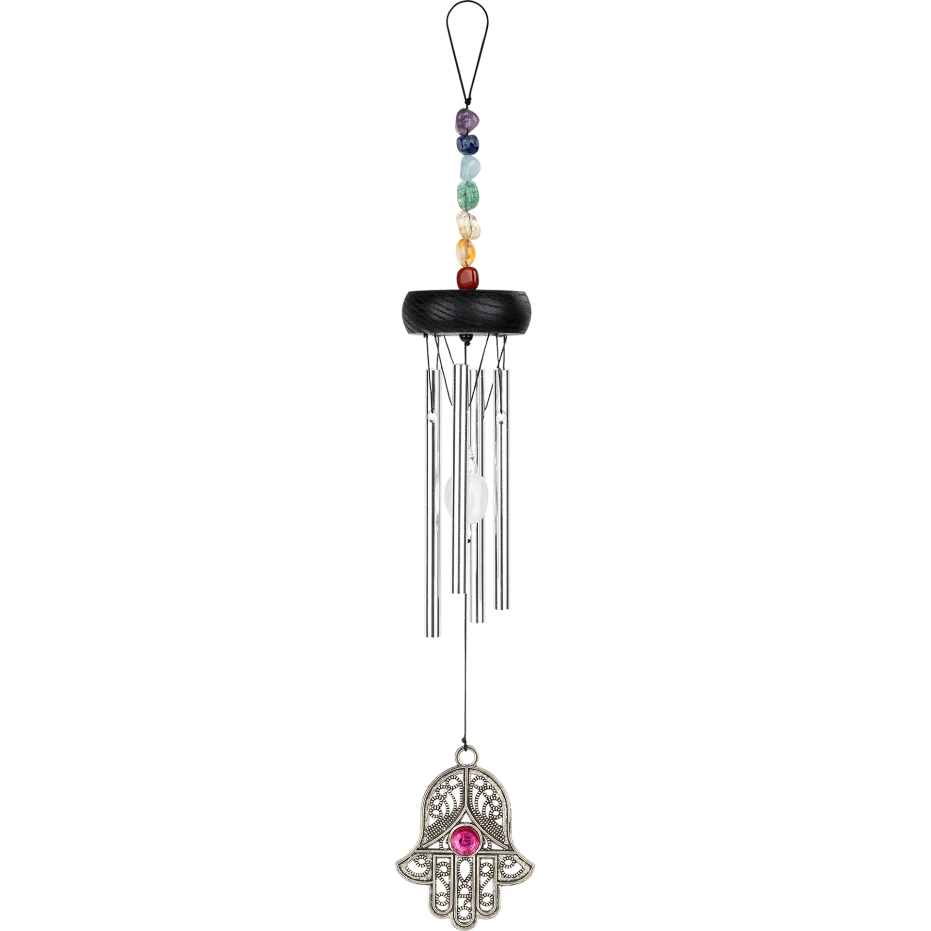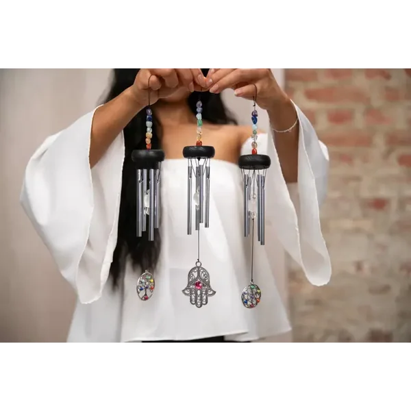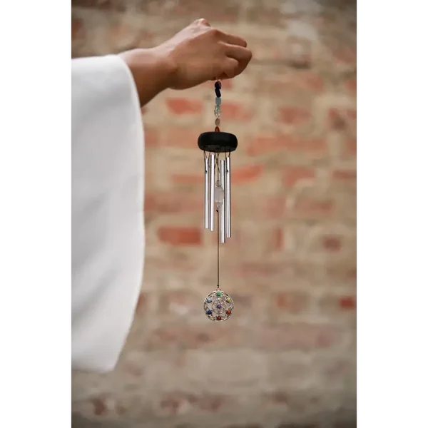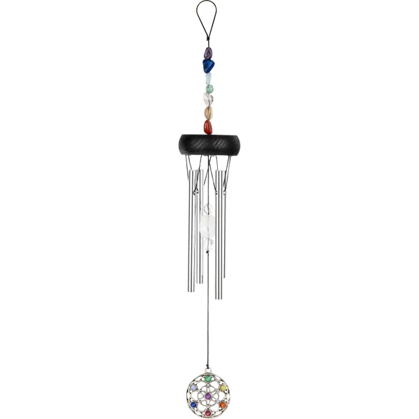 Mini Chakra Chimes, son agréable & harmonieux. Orné de sept pierres aux couleurs des chakras, ajoutant une dimension visuelle et énergétique à ses propriétés sonores.